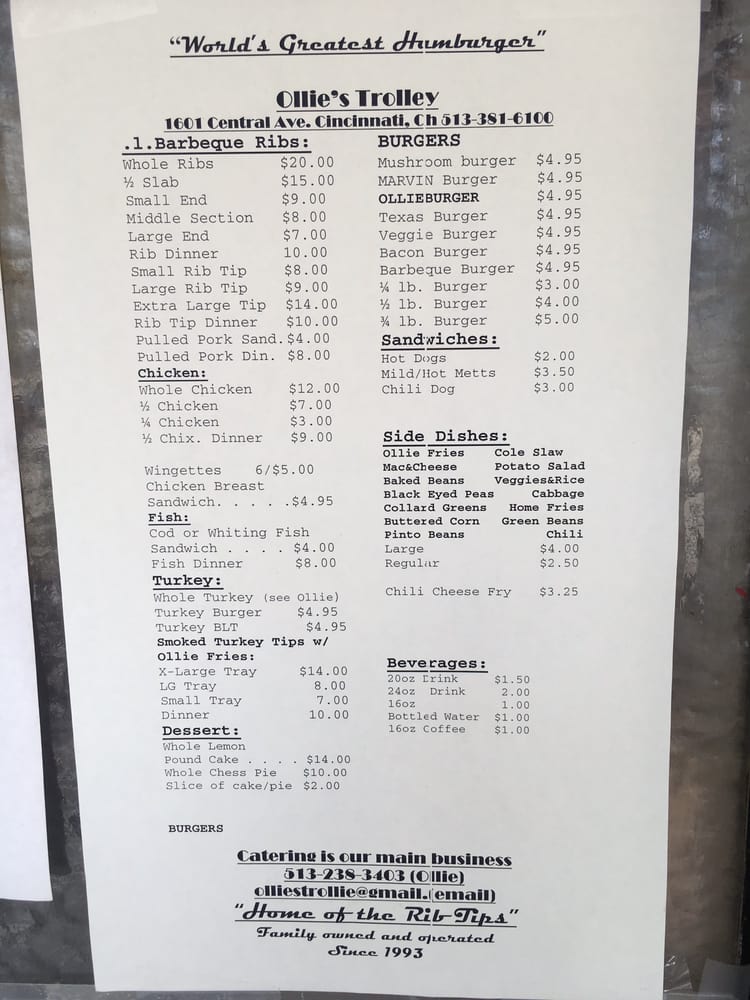 Introducing the menu at Ollie's Trolley, a nostalgic burger and soul food joint located in Cincinnati, Ohio. Known for its iconic red streetcar and flavorful seasoned fries, Ollie's Trolley offers a variety of dishes ranging from BBQ ribs and burgers to metts and breakfast bowls. Customers rave about the delicious Ollie Burger, Mushroom Bacon Burger, and Queen City Sausage. The menu also includes options for vegetarians, like the Veggie Burger. With a history dating back to the 1970s, Ollie's Trolley remains a cherished spot for locals and nostalgic visitors alike. Don't miss out on the opportunity to taste a piece of American takeout history at Ollie's Trolley.